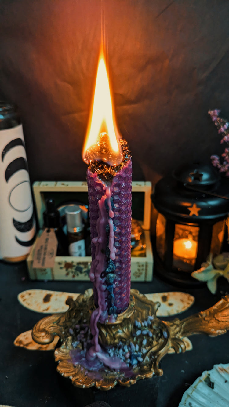 Utilisez la magie des bougies pour vos rituels d'intentions, grâce à nos bougies roulées à la mains en cité d'abeilles et plantes magiques