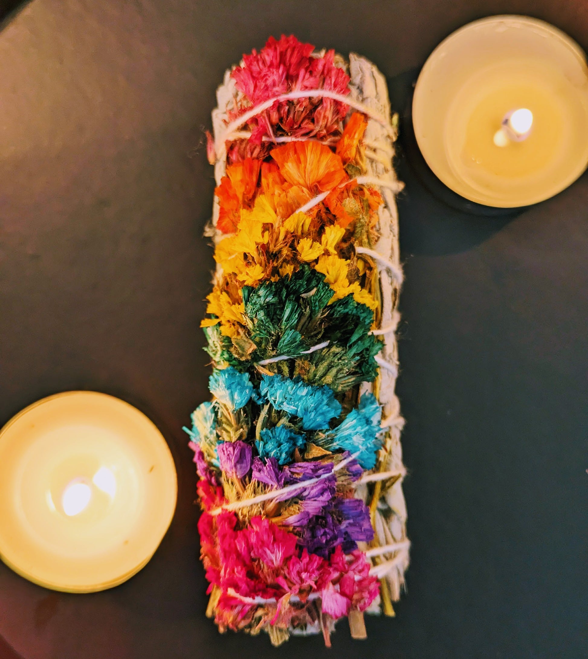 Le bâton de fumigation 7 chakras composé de sauge blanche et de fleurs de sinuata est idéal pour l'équilibrage énergétique et l'alignement des chakras.