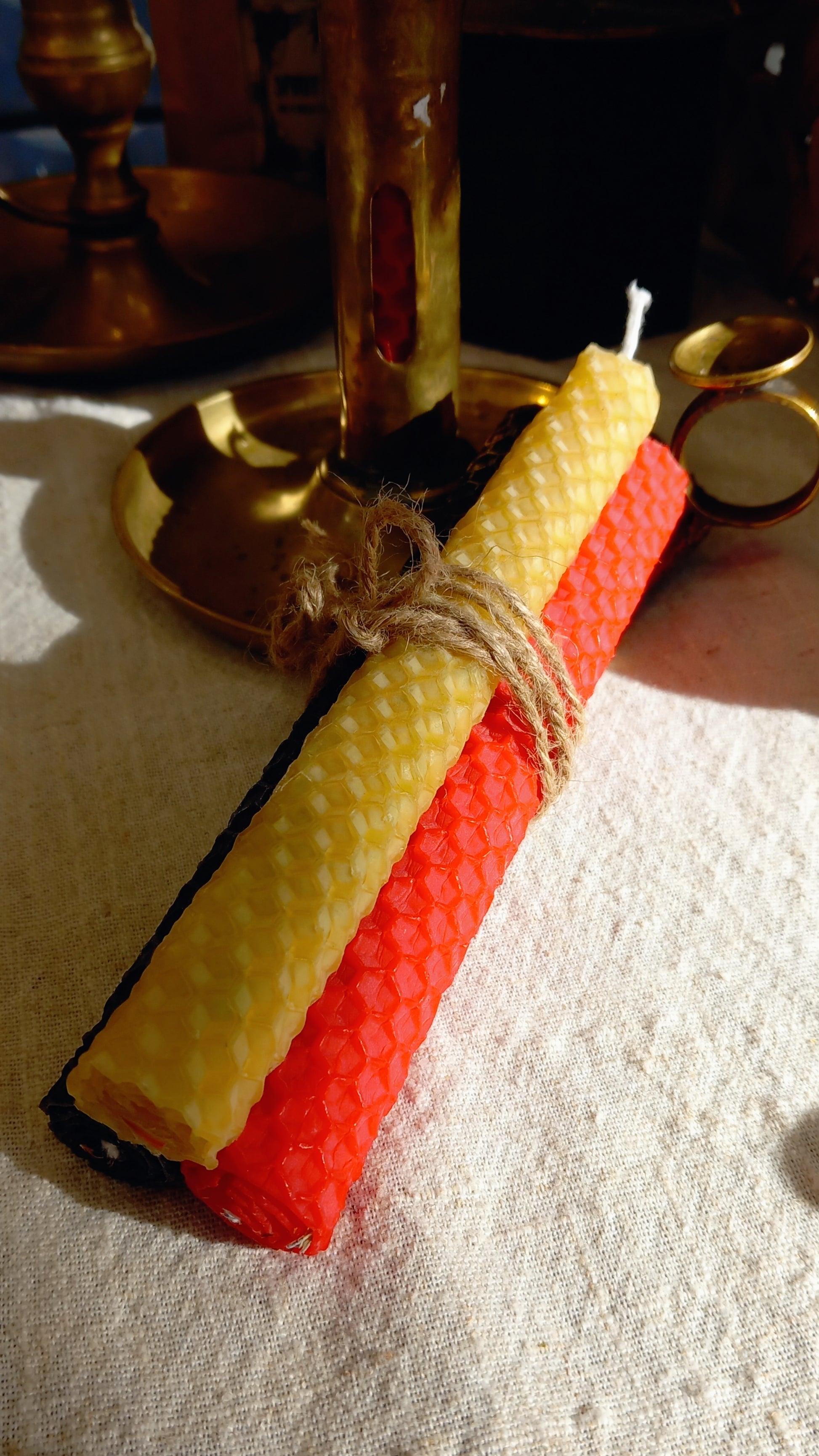 Les bougies rituels sont roulées à la main en cire d'abeille et plantes.