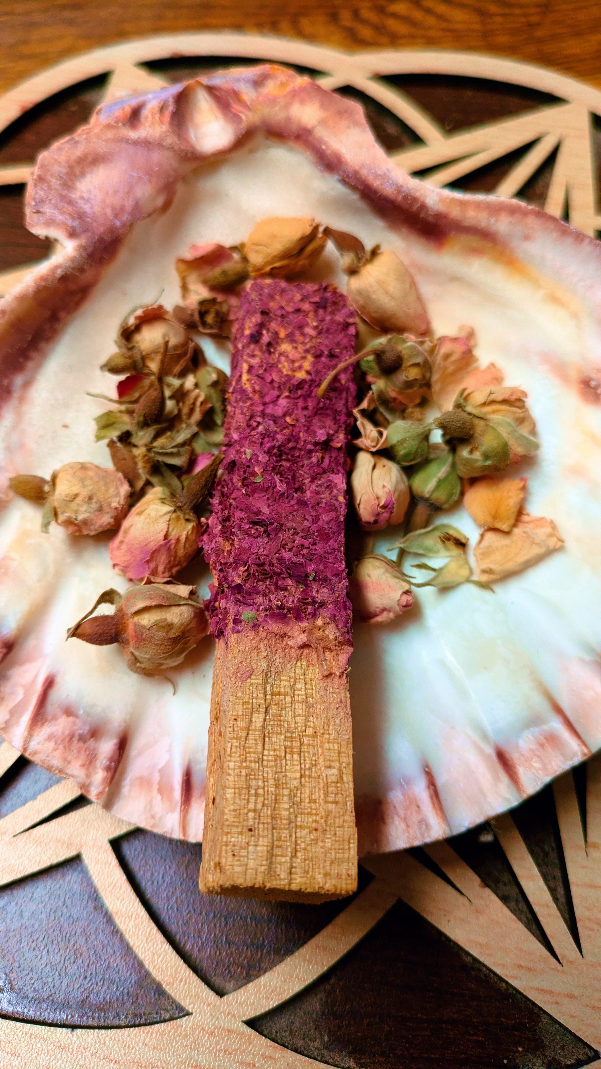 Bois sacré, les pouvoirs purifiants du palo santo sont incontestables, ajouté à cela la rose plante connu pour attirer l'amour, et favoriser les relations sentimentales.