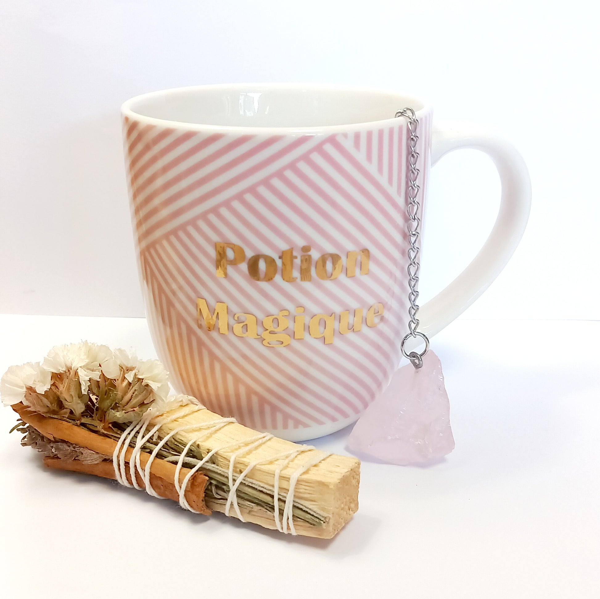 Infuseur à thé en acier inoxydable avec pierre de Quartz rose brute.