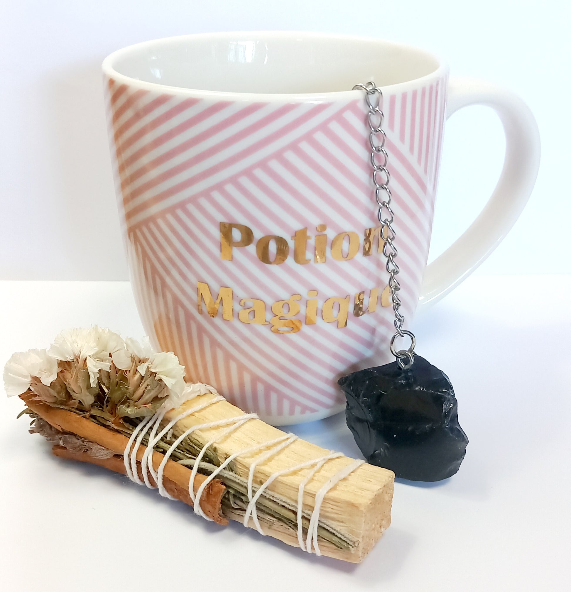 Infuseur à thé en acier inoxydable et pierre Obsidienne brute.
